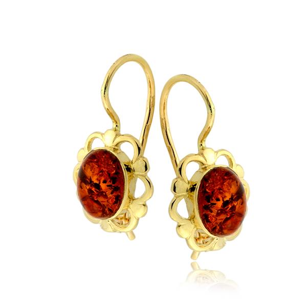 Złote kolczyki na biglu z bursztynem 8x6