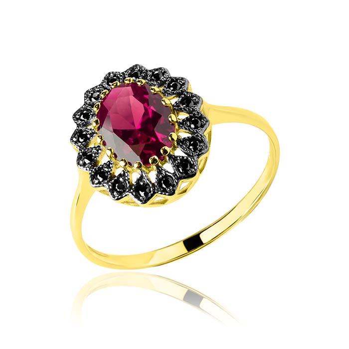 Masa: 2,20g Kamień centralny: rubin syntetyczny 8x6 Kamienie boczne: czarna cyrkonia 1,10 mm