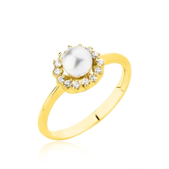 Złoty pierścionek z perłą hodowlaną i cyrkoniami