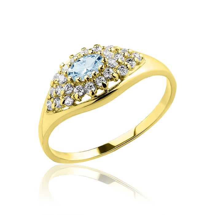 Złoty pierścionek z akwamarynem i cyrkoniami