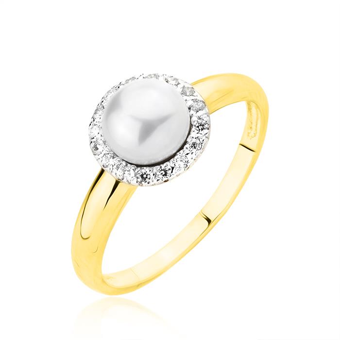 Złoty pierścionek z perłą hodowlaną i cyrkoniami